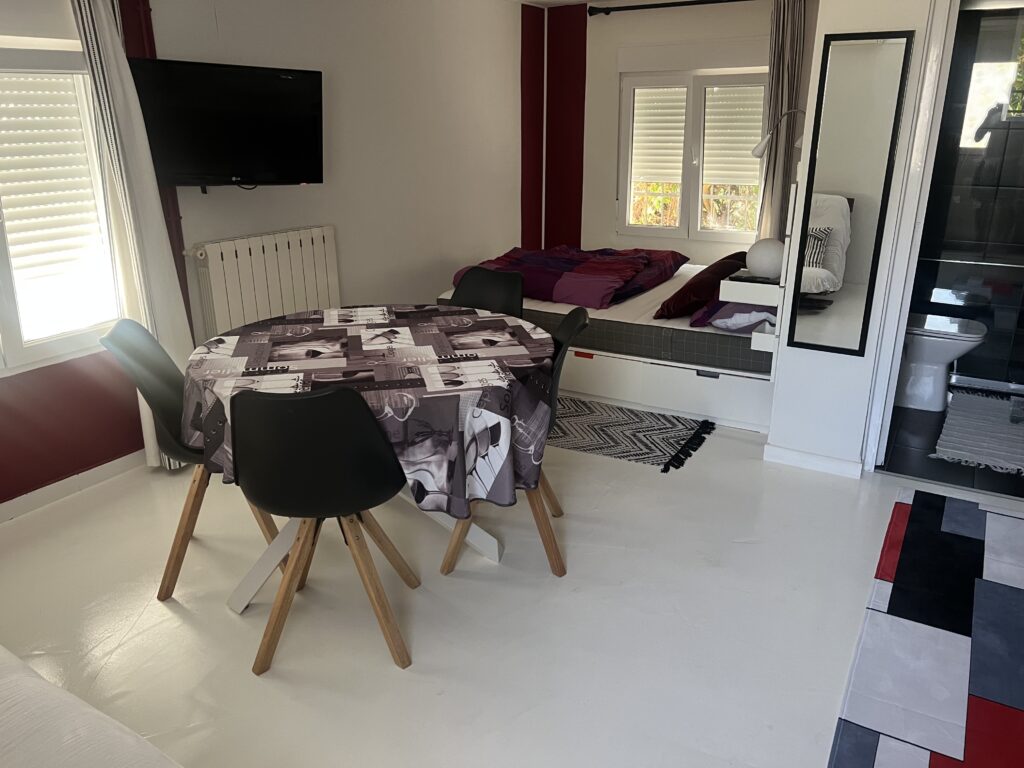 Vous y trouverez un coin chambre avec un lit double, ainsi qu’un coin salon, avec un canapé convertible et une table à manger.
